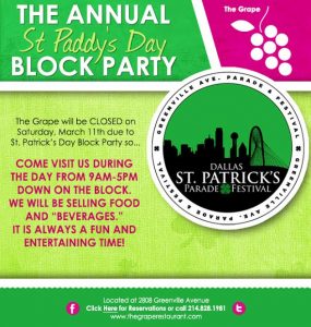 It is that time of year again! The Grape WILL BE CLOSED FOR DINNER ON SATURDAY, MARCH 11TH due to the St. Patty's Day Block Party on Greenville Ave. Come visit us during the day from 9am-6pm as we sell food and beverages down on the block. Always an entertaining time!